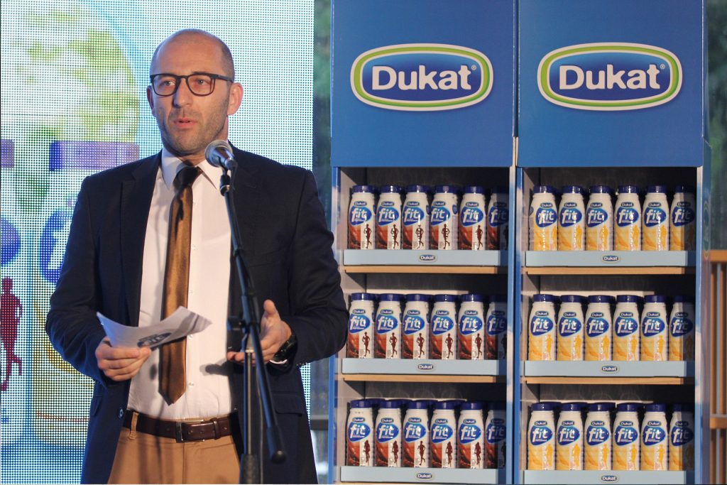 U fitnes outfitu moderator, poznati TV voditelj Aleksandar Hršum, prisutne je upoznao sa karakteristikama proizvoda, animiravši ih da vježbaju uz Dukat Fit demonstrirajući sa zgodnim hostesama i mini set vježbi praktičan za početnike.